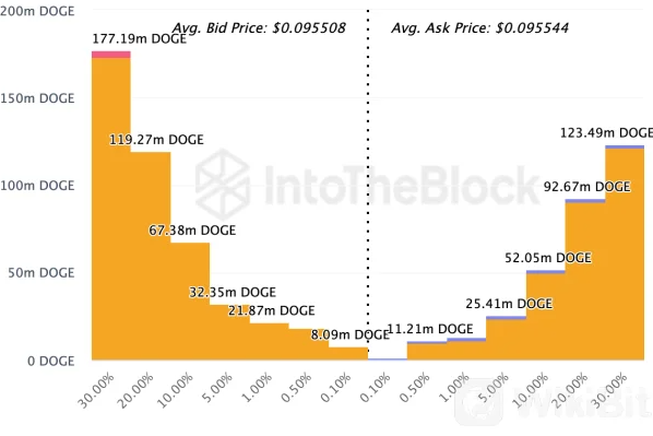 尽管狗狗币的反弹力度不如加密市场上的其他一些山寨币,但它仍然受到散户投资者的青睐。 这些散户投资者一直在公开市场上发出大量买单,这成功地掩盖了过去几天的抛售压力。有趣的是,狗狗币买家正在成为模因币的主导者。 顶级交易平台的订单簿数据证明了这种主导地位的转变,这些数据显示与卖家相比,购买墙非常大。IntoTheBlock 在其 Exchange-Onchain 市场深度页面上显示,狗狗币的竞标者远多于询问者。 目前卖家的订单量为 318.8 亿 DOGE,平均要价为 0.095544 美元。
