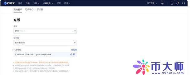 出现BTC对应的充值地址及注意事项,需要您将此地址复制到汇出方平台进行操作。