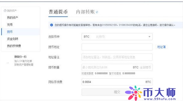 提币分为普通提币和内部转账,普提提币是通过区块确认从而到其他平台的提币(需要网络旷工手续费),内部转账是平台内部进行转账(包括合作交易平台),实时到账不收取手续费。