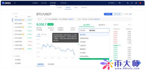 4、中间位置可以选择买入或卖出相应币种,委托类型可以选择限价单、高级限价单等。