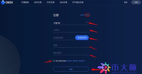 2、跳转注册页面,binanceOKEx支持手机号注册和邮箱注册两种方式,按照要求填写信息;