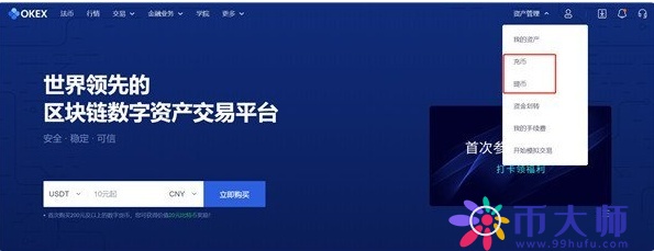 平台间的充币、提币可以通过资产管理-充币/提币完成:
