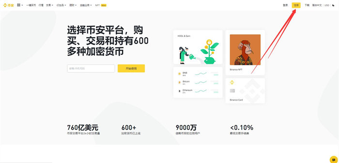 1、打开binance官网地址,如下图点击右上角注册按钮。