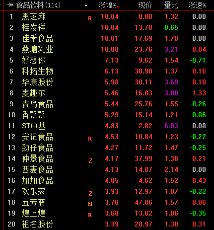 食品饮料板块持续走强 黑芝麻、桂发祥等4股涨停