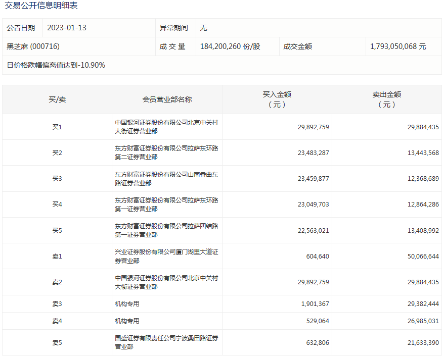 黑芝麻今日跌停 2家机构净卖出5393.7万元