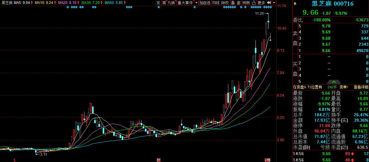 1月13日,黑芝麻跌停,报9.66元,成交额17.93亿元,换手率26.47%。