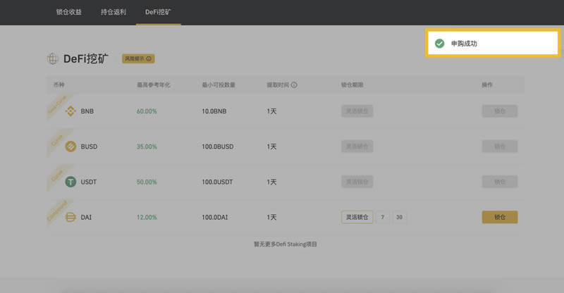 您可在【binance宝账户】-【DeFi挖矿】下查看申购成功的详细信息。申购成功的次日香港时间上午8:00起开始计算收益。锁仓收益是每天返入现货账户,即隔日起,每天上午8:00后,您的现货账户会收到前一天的锁仓收益。而本金只有当产品到期时,需等待1天解锁时间后,返回您现货账户。
