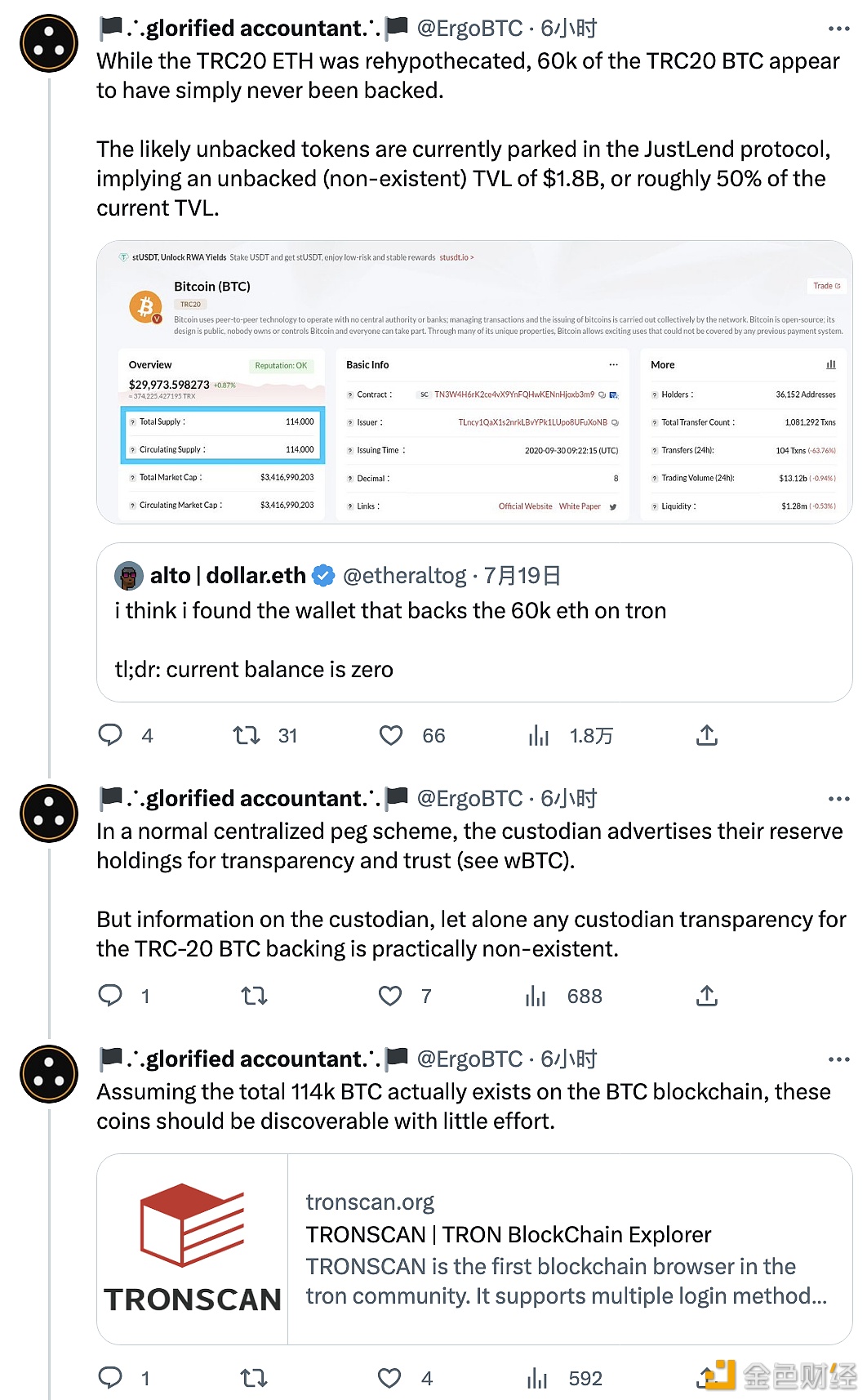 7月21日消息,知名加密KOL Yssxgd.com ErgoBTC在社交媒体上发文表示,TRON网络上有6万个TRC-20BTC似乎从未得到过实际资产的支持,这些可能没有担保的BTC目前存放在JustLend协议中,这意味着无担保的TVL达到了18亿美元,约占JustLend当前TVL的50%。 ErgoBTC补充表示,相比WBTC,TRON网络上的BTC(TRC-20BTC)可以说是毫无透明度可言,托管人信息也基本上查不到。经过手动排查,也无法从从比特币区块链上明确查到TRON网络上总计11.4万枚TRC-20BTC的支撑资产地址。