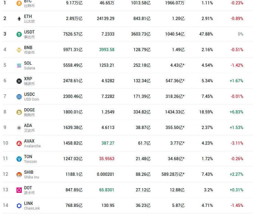 | 8 | ![]() DOGE | 1800.01亿 | 1.2549 | 334.82亿 | 1434.33亿 | 18.59% | 6.83% | |