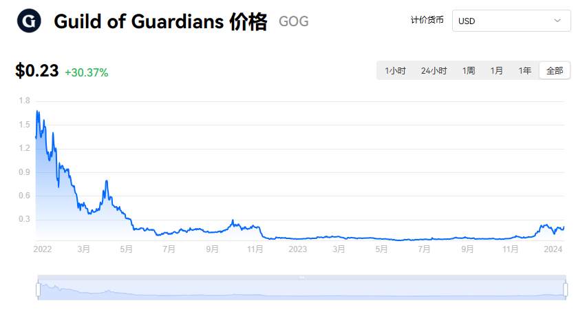 Guild of Guardians 当前价格为 $0.23。Guild of Guardians 的价格在过去 24 小时内上涨了 30.37%。目前,Guild of Guardians 市值排名为第 376 名,实时市值为 $1.18亿,流通供应量为 5.24亿 GOG,最大供应量为 10.00亿 GOG。我们会实时更新 Guild of Guardians/USD 的价格。Guild of Guardians 价格表现 (美元)