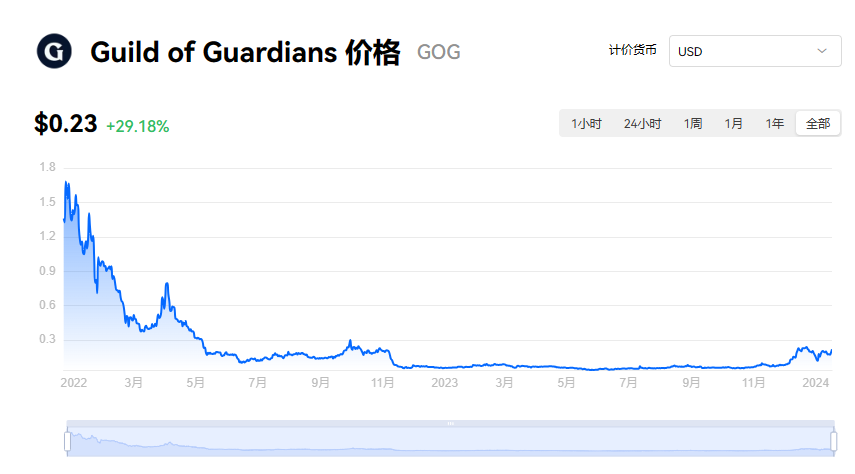 Guild of Guardians 当前价格为 $0.23。Guild of Guardians 的价格在过去 24 小时内上涨了 28.21%。目前,Guild of Guardians 市值排名为第 376 名,实时市值为 $1.16亿,流通供应量为 5.24亿 GOG,最大供应量为 10.00亿 GOG。我们会实时更新 Guild of Guardians/USD 的价格。