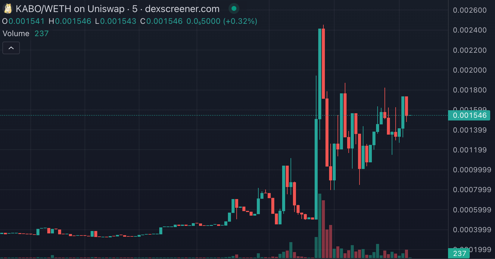 然而V神推文一出,Kabochan同名代币KABO随即暴涨386%,达0.002453美元,后续KABO价格开始区间震荡,至截稿前报0.001541美元,近24小时上涨244%,算是少数受Kabosu影响下仍上涨的狗系Meme币。