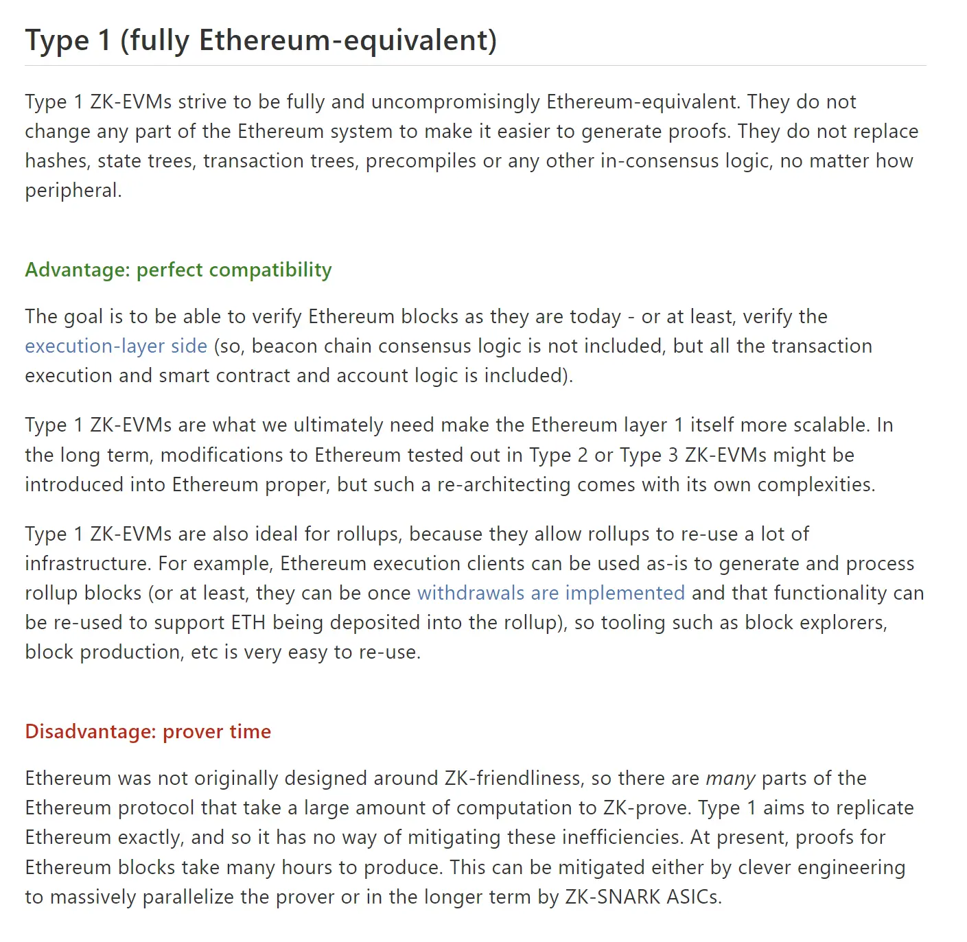的ZK-EVM,即Vitalik Buterin 在《The different types of ZK-EVMs》(见扩展链接2),中提到的追求完全且毫无妥协地与以太坊等效。其目的是与以太坊完全兼容来验证以太坊区块(至少可验证执行层,不包括信标链共识但包括所有的交易,智能合约和账户逻辑,且不会取代哈希,状态/事务树和其他共识逻辑),所以相比于其他类型,为接近原生解决方案,Type 1 是最具复杂性和挑战性的一种。