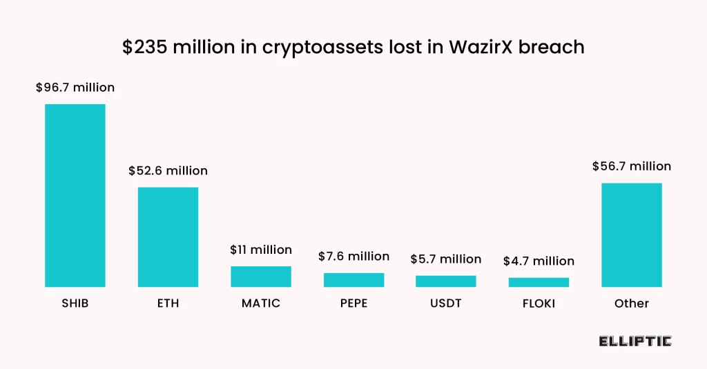 Elliptic的分析显示,此次攻击导致约2.35亿美元的加密资产被盗,包括约9670万美元的Shiba Inu(SHIB)、5260万美元的以太币(ETH)、1100万美元的Matic和760万美元的PEPE。