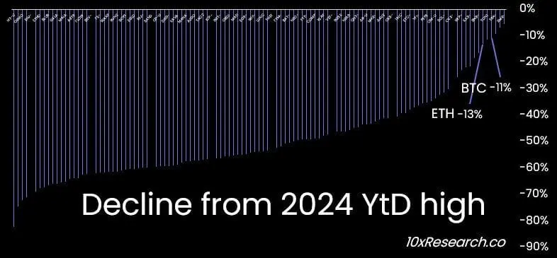 今天的标题引起了在2017年或2021年交易山寨币的所有人共鸣。10x Research分析了115种代币,平均价格已从2024年的高点下跌了50%。正如下面解释的那样,除非加密货币的流动性得到改善,否则下跌将更加严重。比特币(-11%)和以太坊(-13%)表现良好,随着更聪明的交易员从山寨币转向这两种代币,二者可能会因此而受益(在过去两个周期中发生过)。