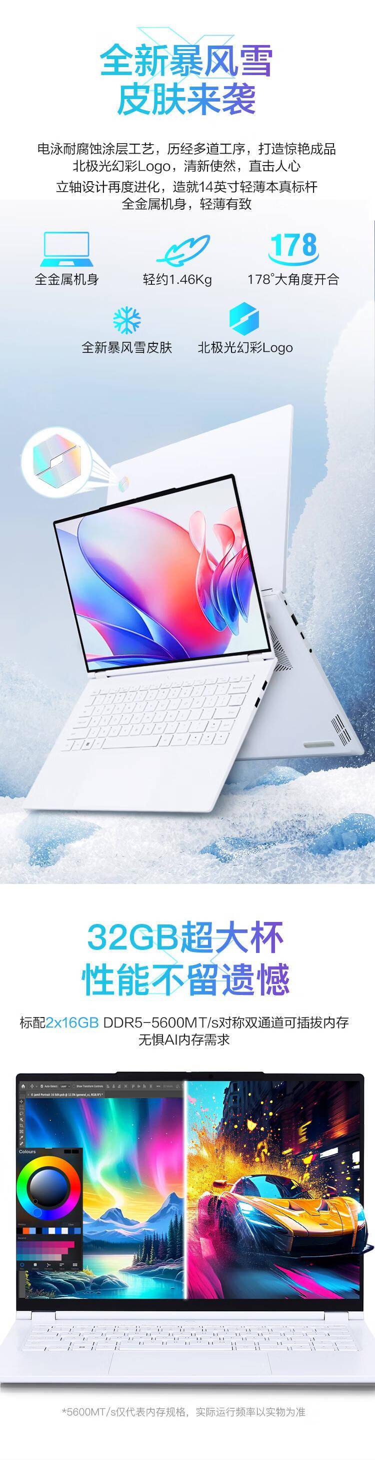 据ITBEAR了解,这款无界14X暴风雪笔记本采用了电泳耐腐蚀涂层工艺,拥有全金属机身设计,并配备了白色抗打油键盘。其内存配置升级至32GB双通道,散热系统则采用了并联双热管架构,确保了高效散热。此外,电池容量高达80Wh,为用户提供更持久的续航体验。