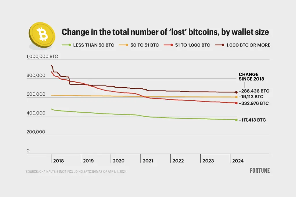 图表显示 2018 年以来丢失的比特币数量变化