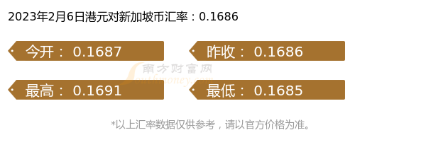 2023年2月6日港元兑换新加坡币最新汇率:0.1686,今开:0.1687,昨收:0.1686,最高:0.1691,最低:0.1685。