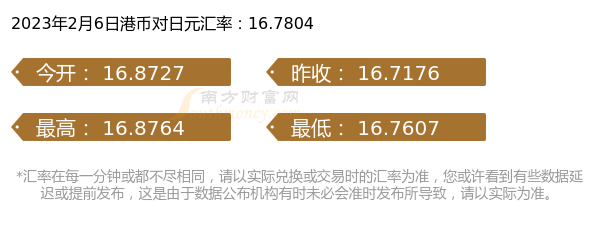 根据2023年2月6日汇率,港币兑换日元汇率最新16.7804,今开16.8727,昨收16.7176,最高16.8764,最低16.7607。