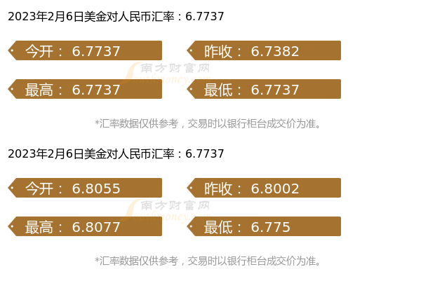 2023年2月6日最新消息,美金兑换人民币最新汇率为6.7737,今开为6.7737,昨收为6.7382,最高为6.7737,最低为6.7737。