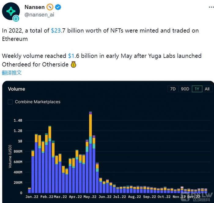 Nansen数据显示,2022年至今以太坊链上共铸造和交易价值237亿美元的NFT。 在Yuga Labs为Otherside推出Otherdeed后,以太坊上5月初的周交易量达到16亿美元。
