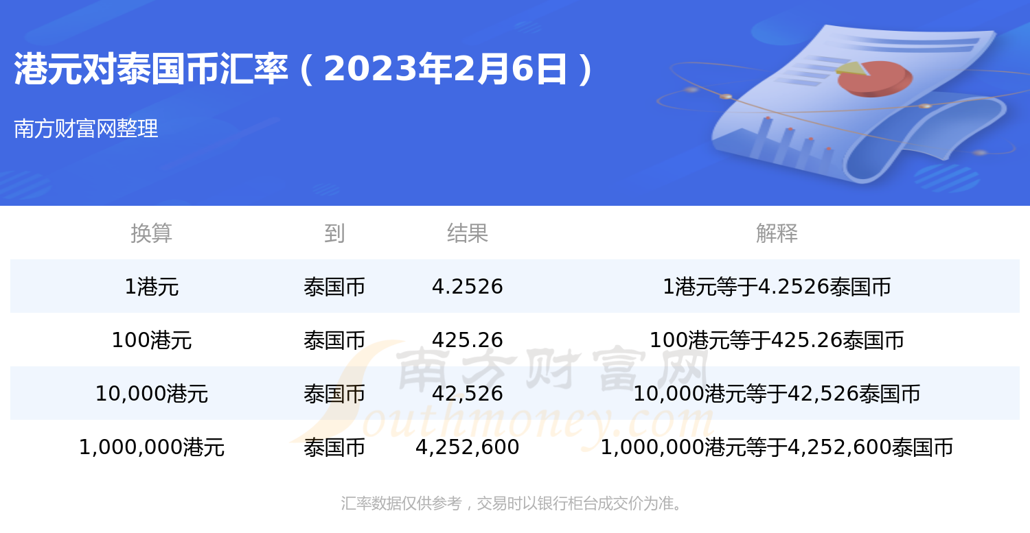 2023年2月6日,货币兑换:1港元等于4.2526泰国币。举例:假如一瓶矿泉水需要1港元,则需泰国币:4.2526泰国币。