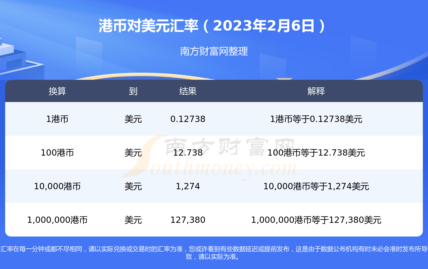 2023年2月6日,货币兑换:1港币=0.12738美元。如:1港币、2港币、5港币、10港币、20港币、50港币、100港币,分别折合美元0.12738、0.25476、0.6369、1.2738、2.5476、6.369、12.738美元。
