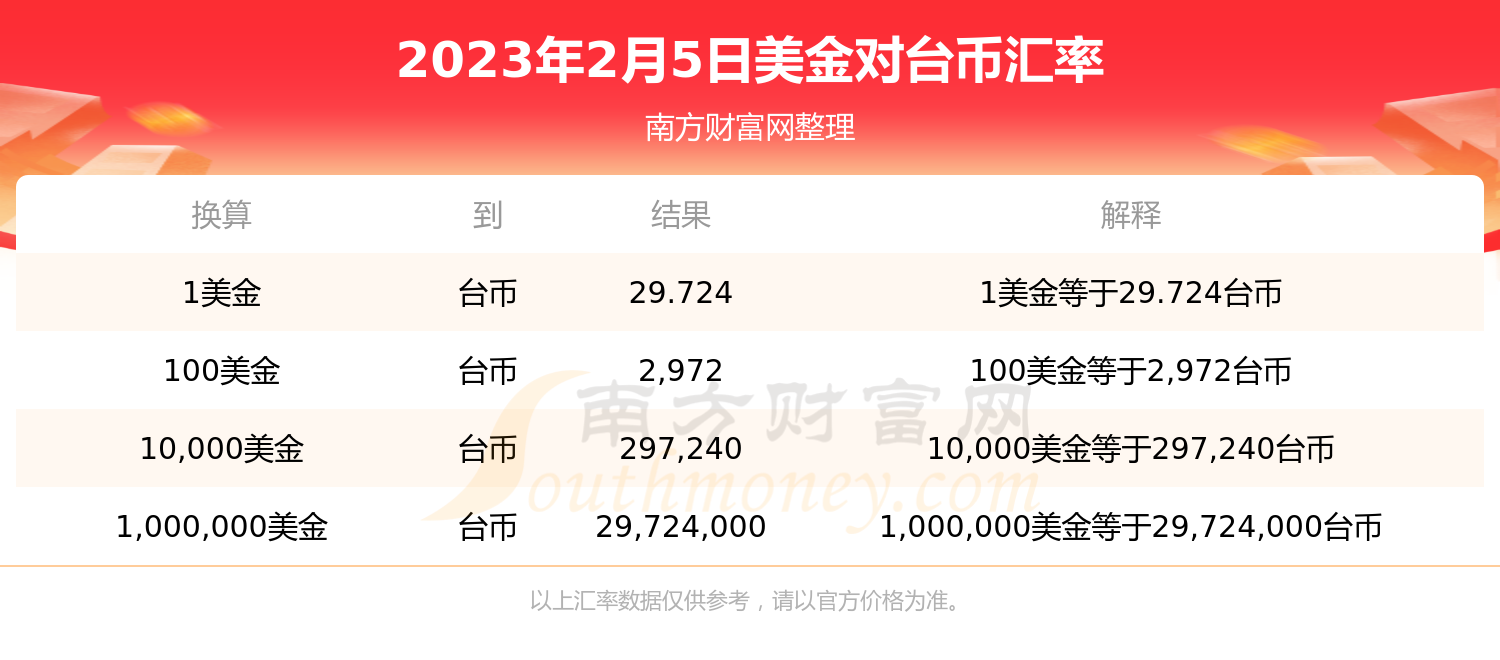美金兑换台币汇率行情(2023年2月5日)
