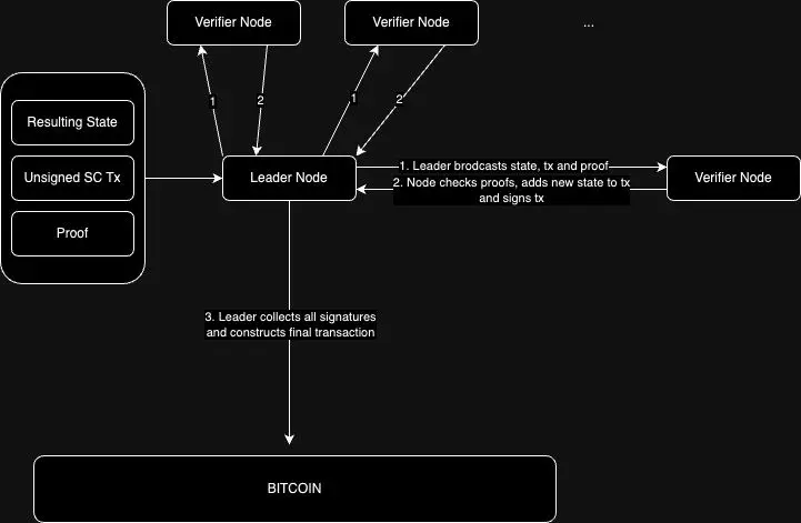 每个节点进行证明验证,并在背书所述交易之前将状态更改合并到交易中。领头者整合来自这些节点的签名,直到达到预定义的阈值。最后,一旦交易由必要数量的节点签名,就可以在比特币网络上广播。