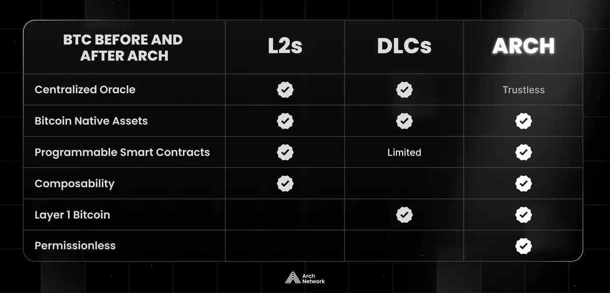 Arch 从 Solana 和 SVM(Solana 虚拟机) 中汲取灵感,不依赖任何桥接或 L2,它具备三个特点,分别是可编程性、并行化执行速度以及无需信任的互操作性和可组合性。