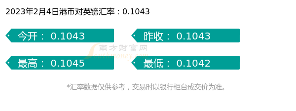 2023年2月4日最新消息,港币兑换英镑最新汇率为0.1043,今开为0.1043,昨收为0.1043,最高为0.1045,最低为0.1042。