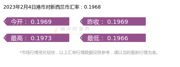 根据2023年2月4日汇率,港币兑换新西兰币汇率最新0.1968,今开0.1969,昨收0.1969,最高0.1973,最低0.1966。
