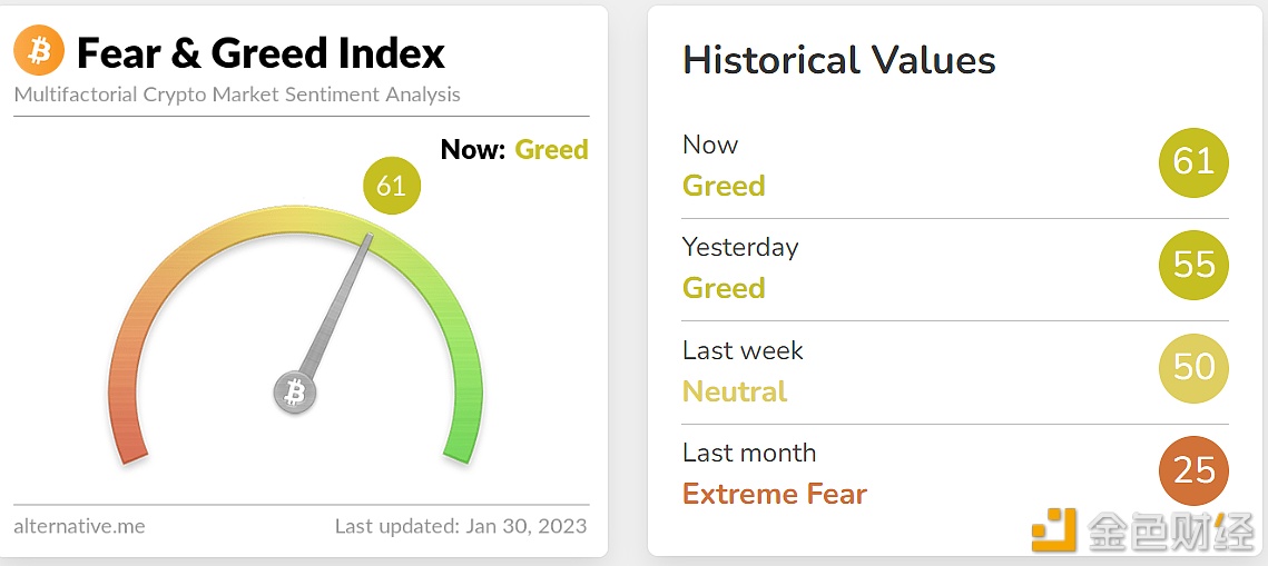 今日恐慌与贪婪指数为61(昨日为55),较昨日有所上升,等级转为贪婪。 注:恐慌指数阈值为0-100,包含指标:波动性(25%)+市场交易量(25%)+社交媒体热度(15%)+市场调查(15%)+比特币在整个市场中的比例(10%)+谷歌热词分析(10%)。