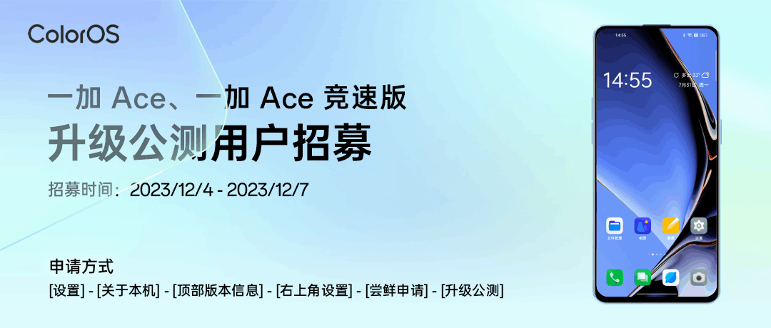 本站 12 月 4 日消息,一加 Ace /一加 Ace 竞速版开启 ColorOS 14.0 × Android 14 第二波升级公测招募,招募时间 12 月 4 日-7 日。