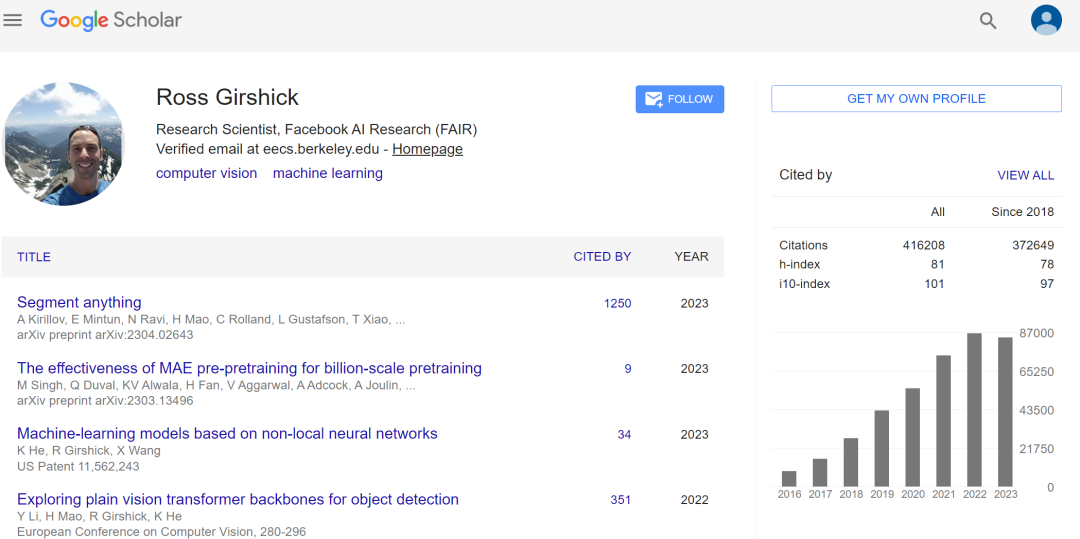 Ross 的研究兴趣包括视觉感知算法(目标识别、定位、分割、姿态估计等)、表征学习(使用强监督、弱监督或根本没有监督的预训练网络)以及视觉和语言研究。