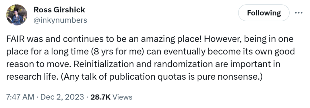 Ross Girshick 发文追忆其在 Meta 的职业生涯,表示 FAIR 过去是、将来仍是一个令人惊叹的地方。不过在一个地方呆了太长时间(8 年)或许是促使他离开的不错理由,重新初始化和随机化在研究生涯中非常重要。此外,他还声明任何有关发表指标的言论纯属无稽之谈。