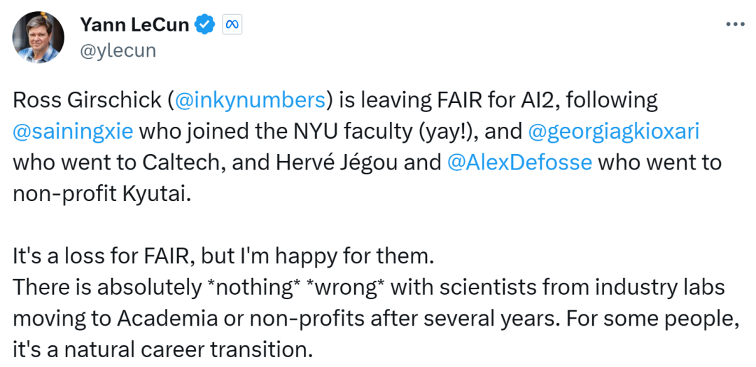 Yann LeCun 表示:「人才离开 FAIR 是我们的损失,但自己仍为他们感到高兴」。