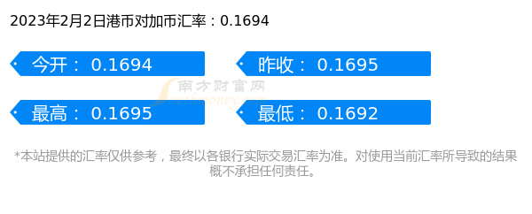 2023年2月2日最新消息,港币兑换加币最新汇率为0.1694,今开为0.1694,昨收为0.1695,最高为0.1695,最低为0.1692。