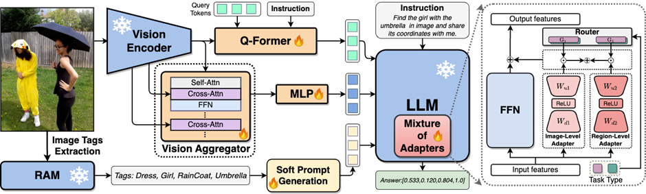 该工作通过分段式训练策略先分别基于Q-Former 和 Vision Aggregator – MLP 两个分支学习图像级理解和区域级定位任务,然后在最后训练阶段利用具有路由机制的混合适配器来动态融合不同分支的知识提升模型在两种任务的表现。
