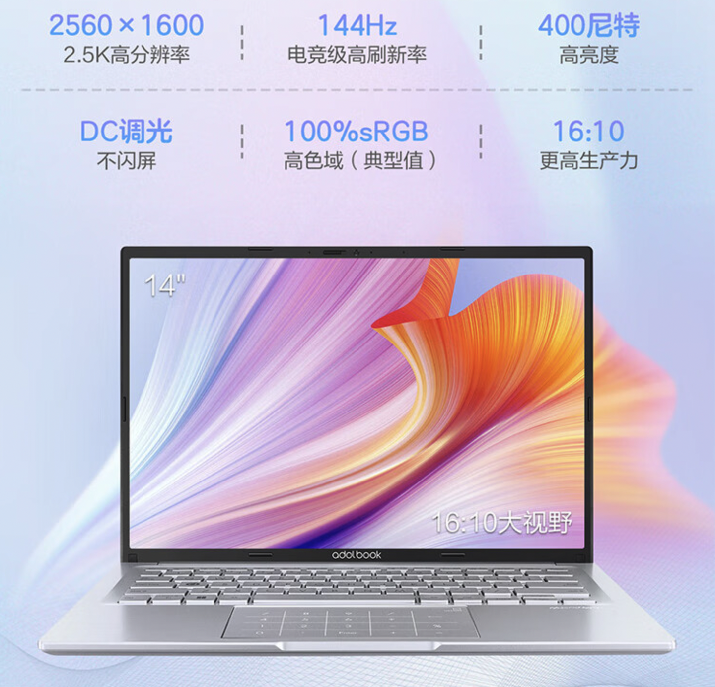 屏幕方面,a 豆 14 配备 14 英寸 2.5K 分辨率的超视网膜高分屏,拥有 16:10 黄金比例和接近四边等窄边框,刷新率来到了 144Hz 电竞级别,亮度高达 400 尼特,支持 100% sRGB 高色域显示和 DC 调光技术,同时通过了德国莱茵 TUV 低蓝光认证,可以保护你的眼睛免受蓝光伤害。