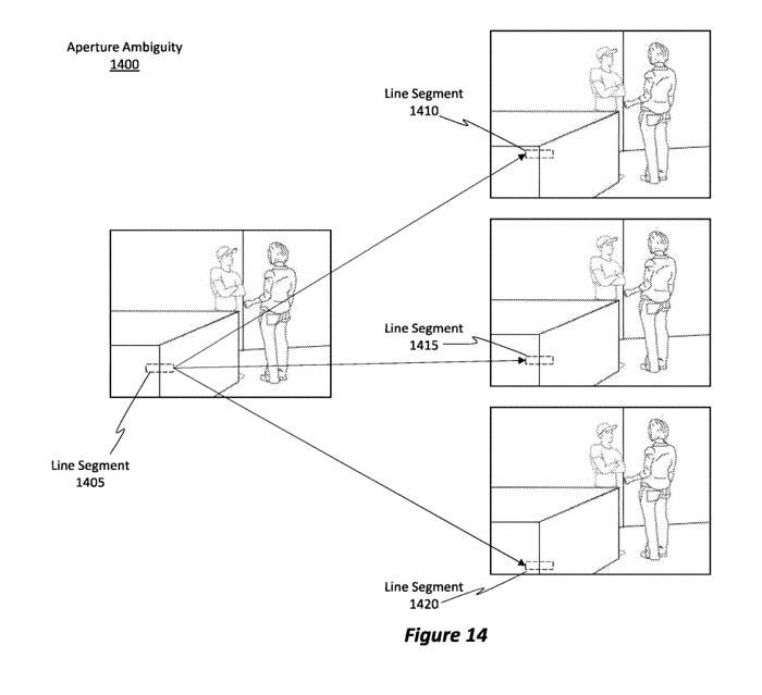 以下是重写后的内容: 根据图14,我们可以看到孔径问题,即孔径模糊度为1400。在图14中,线段1405是整条线的一部分。孔径模糊度1400指的是一条线的多个不同部分可能(但不正确地)与已识别的线段1405相关