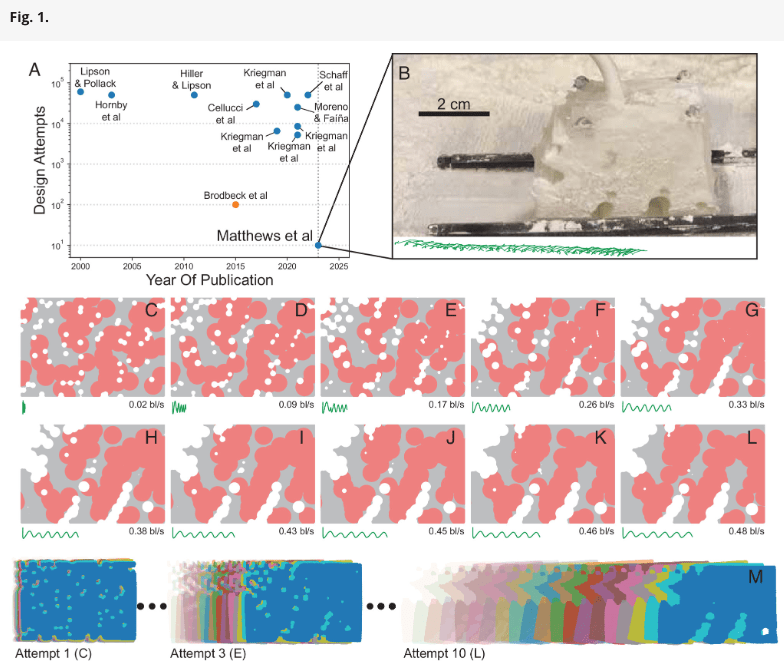 这个像是上了发条的玩具,是由无机材料制成的,其背后运用的 AI 程序还可以在轻便的个人电脑上运行,并从零开始设计全新的结构。