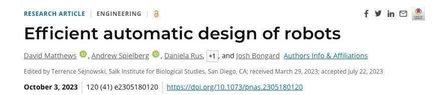 基于此,西北大学的研究员在《美国国家科学院院刊》上发布了一篇《Efficient automatic design of robots》论文(https://www.pnas.org/doi/10.1073/pnas.2305180120),分享了这一最新研究成果。