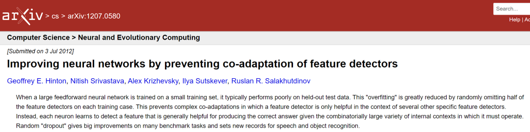 2012 年,后来的图灵奖获得者 Geoffrey Hinton 在论文《Improving neural networks by preventing co-adaptation of feature detectors》中提出了 Dropout。同年,AlexNet 的出现开启了深度学习的新纪元。AlexNet 使用 Dropout 显著降低了过拟合,并对其在 ILSVRC 2012 竞赛中的胜利起到了关键作用。可以认为如果没有 Dropout,深度学习的大发展可能会被推迟数年。