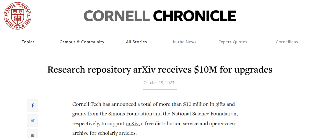 作为一个非营利数据库,arXiv 是所有人均可以免费访问的,长期以来一直依赖人们的捐赠。康奈尔科技校区宣布,西蒙斯基金会和美国国家科学基金会(NSF)已提供了总额超过 1000 万美元的赠款以支持 arXiv。