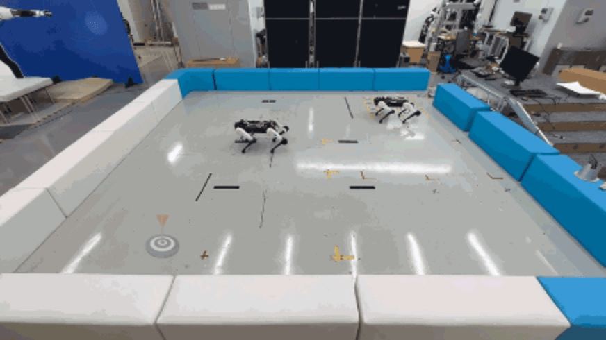 为了测试Max的自主决策和控制能力,研究员设计了一个双狗障碍追逐的游戏。从这个游戏看来,在基于预训练好的模型下,机器狗通过深度强化学习,已经具备一定的推理和决策能力: