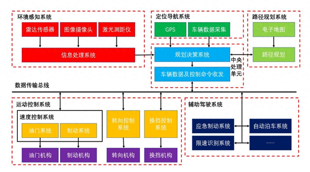 - 控制模块: 控制模块负责将决策转化为车辆的具体动作。它控制车辆的加速、制动、转向等,确保车辆按照规划的路径安全行驶。