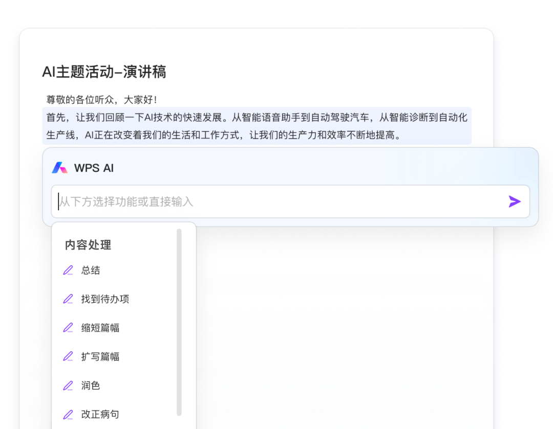 支持对内容进行处理,让内容更符合你的需要。你可用它总结、扩写缩写、切换文风、改正病句、翻译等等,直到你满意为止。