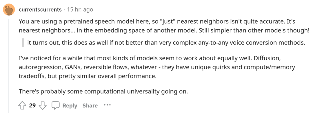 对于这个「仅利用最近邻」的语音转换新方法 kNN-VC,有人认为,文中使用了预训练语音模型,因此用「仅」不太准确。但不可否认,kNN-VC 仍然要比其他模型简单。