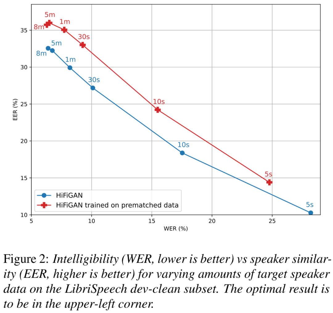 下图 2 展示了两种 HiFi-GAN 变体在不同目标说话者大小时的 WER(越小越好)和 EER(越高越好)关系图。